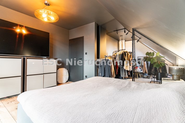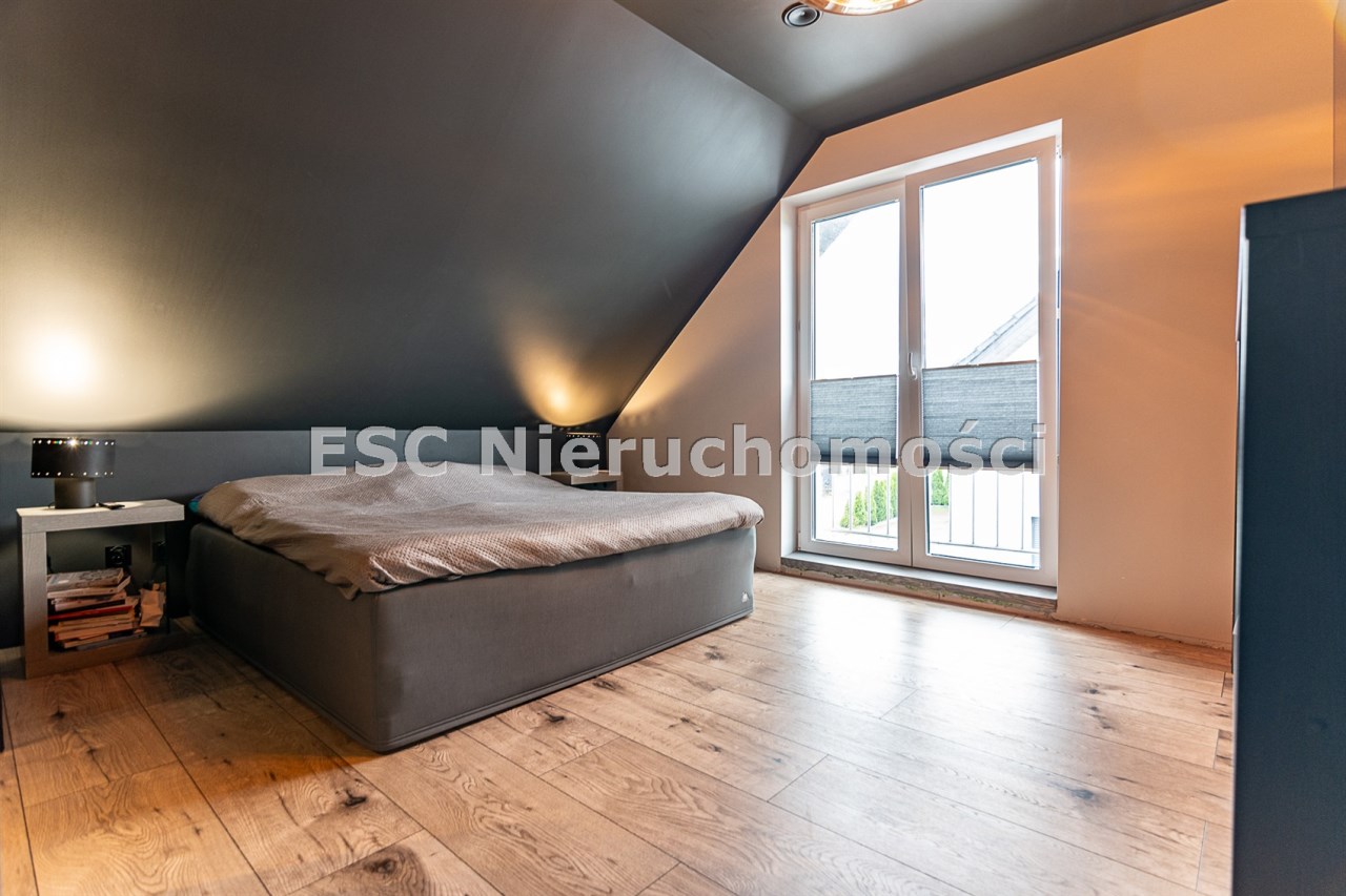 Z części dziennej prowadzi wyjście na rozległy, funkcjonalny taras, który podzielony został na część zadaszoną oraz słoneczną – idealną do wypoczynku. Teren posesji został kompleksowo zagospodarowany, z licznymi nasadzeniami ozdobnych krzewów i podjazdem wyłożonym kostką brukową.