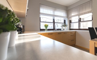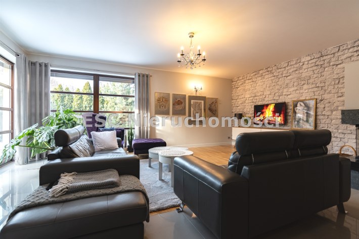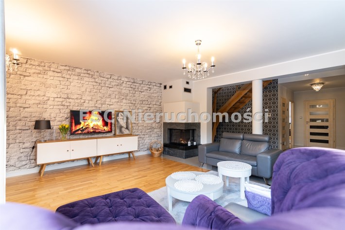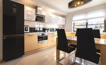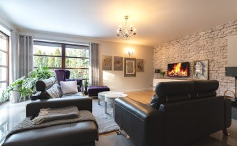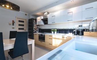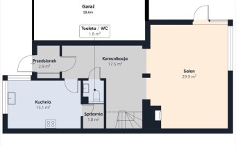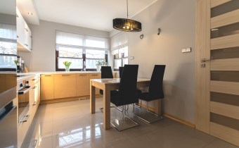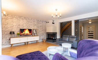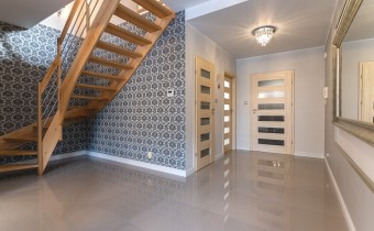 Część dzienna zlokalizowana na parterze została zaprojektowana z myślą o wygodzie domowników i naturalnym świetle. Salon z dużymi przeszkleniami płynnie łączy się z tarasem oraz wyjściem na ogród, tworząc otwartą i przyjazną przestrzeń do wypoczynku. Kominek starannie wykończony naturalnym kamieniem stanowi elegancki akcent wnętrza, a podłogi wykonane z deski barlineckiej podkreślają jego ciepły charakter. Oddzielna kuchnia, wyposażona w zabudowę meblową wykonaną na wymiar oraz sprzęt AGD, oferując wygodną przestrzeń do codziennego użytkowania. Dodatkowym udogodnieniem jest spiżarnia, zapewniająca praktyczne miejsce do przechowywania. Na parterze znajduje się również WC, wiatrołap oraz przestronny przedpokój z wygodnymi i praktycznymi schodami prowadzącymi na piętro.