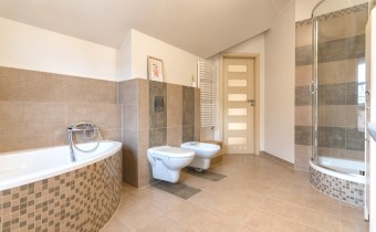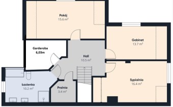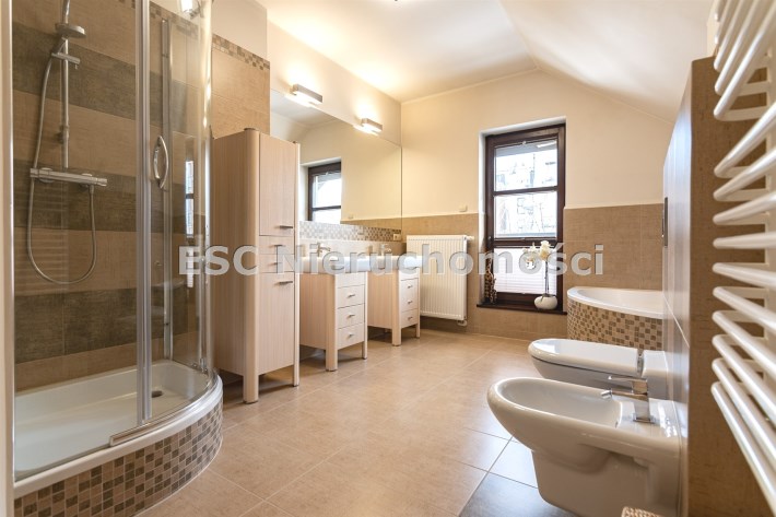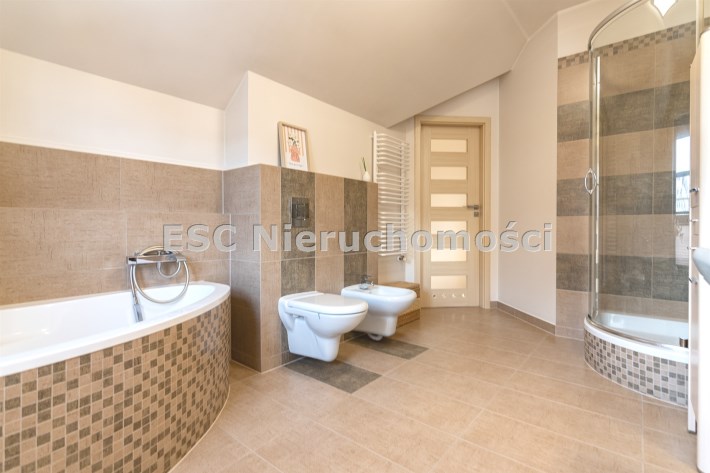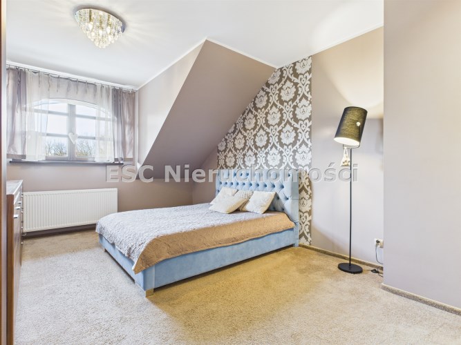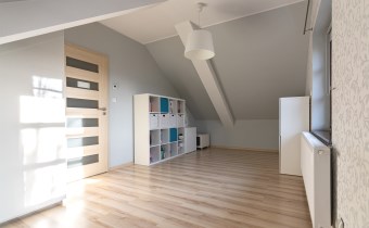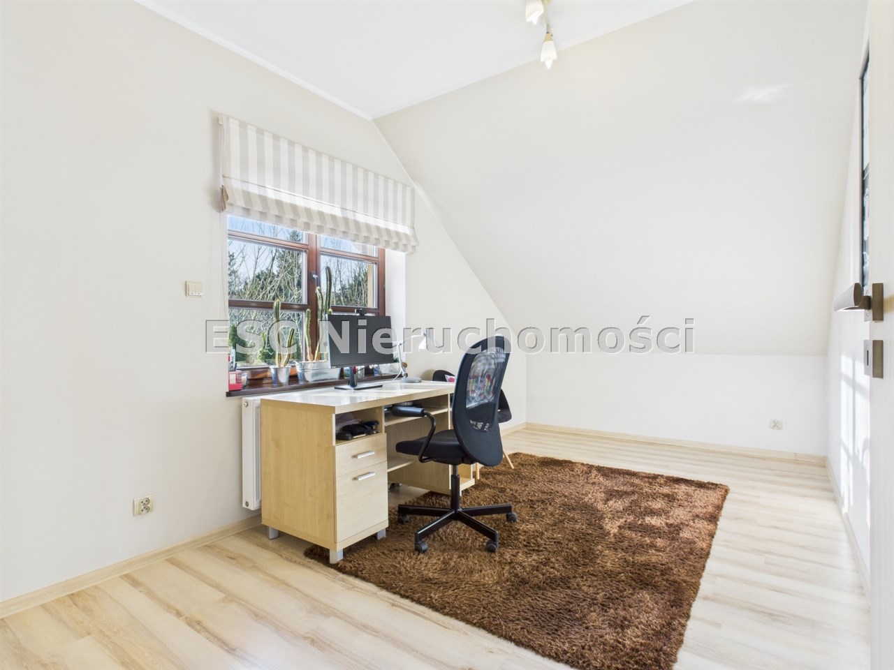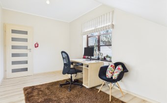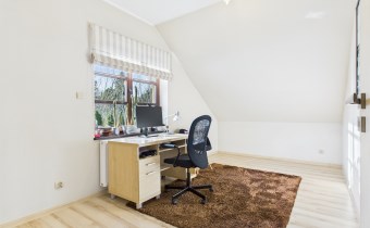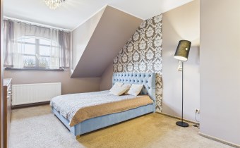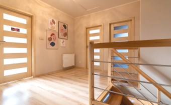 Piętro domu stanowi komfortową strefę prywatną. Znajdują się tu trzy pokoje, w tym sypialnia główna z pojemną 3- drzwiową szafą, gabinet oraz pokój dziecięcy. Pokoje na piętrze bardzo jasne z południową i zachodnią wystawą okien co zapewnia naturalne doświetlenie wnętrz. Do dyspozycji domowników jest przestronna łazienka z oknem, wyposażona zarówno w wannę, jak i prysznic, 2 umywalki, WC oraz bidet. Dodatkowo na piętrze znajduje się osobna garderoba oraz pralnia połączona z kotłownią.