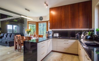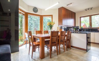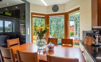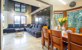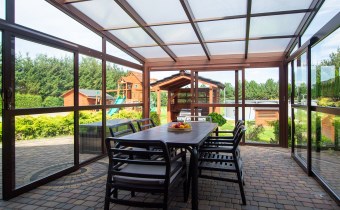 Z salonu wyjście na zadaszony taras, drzwi przesuwne dają możliwość korzystania z niego nawet w chłodniejsze pory roku.