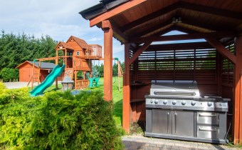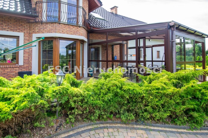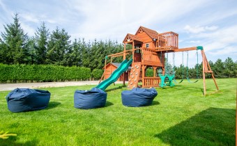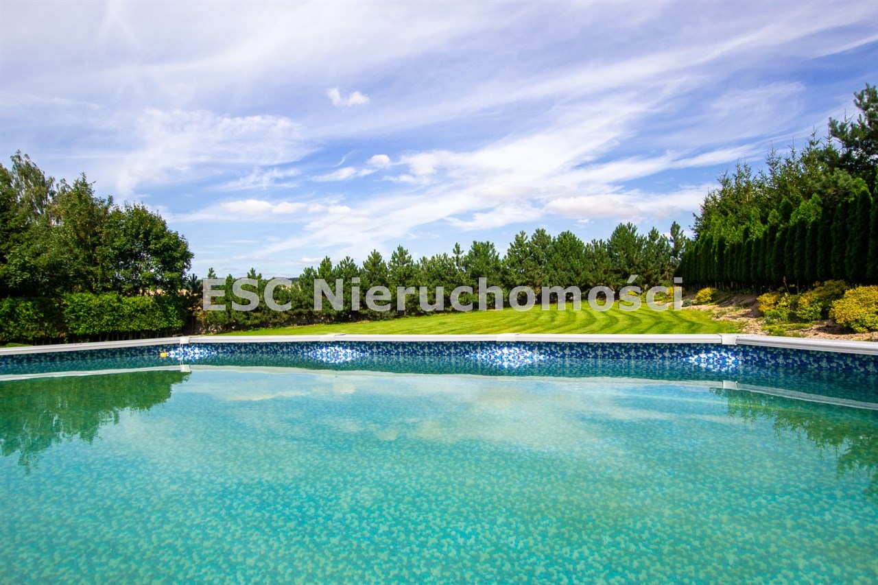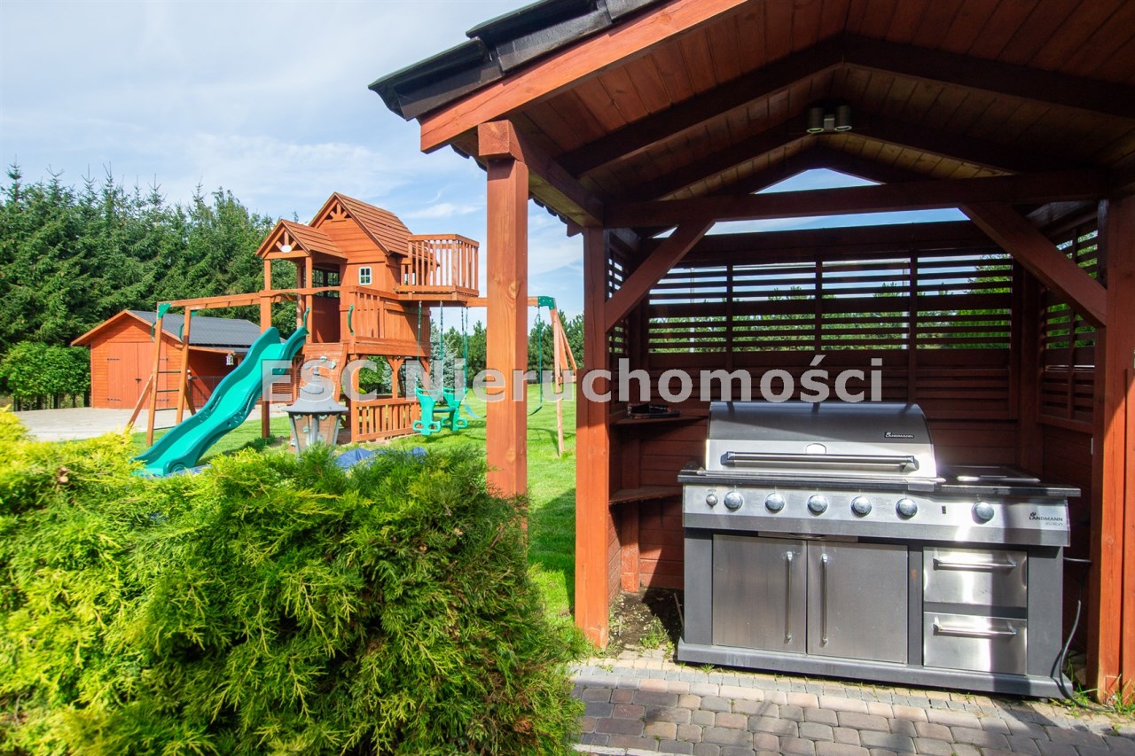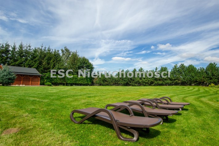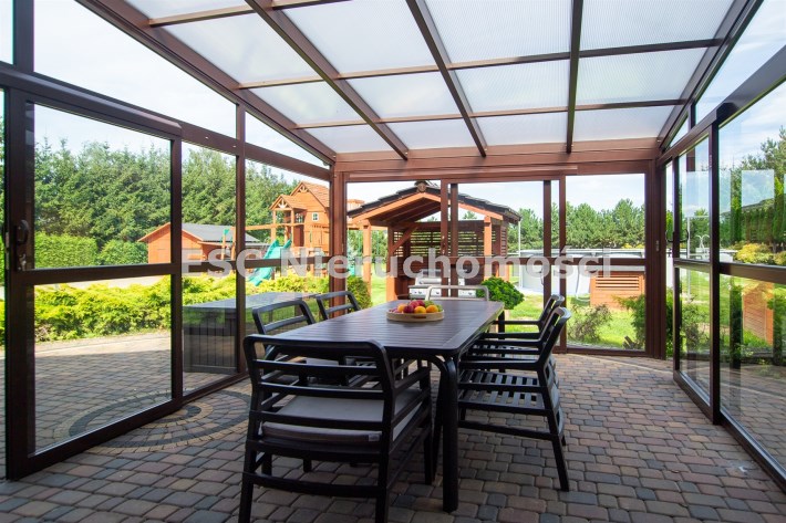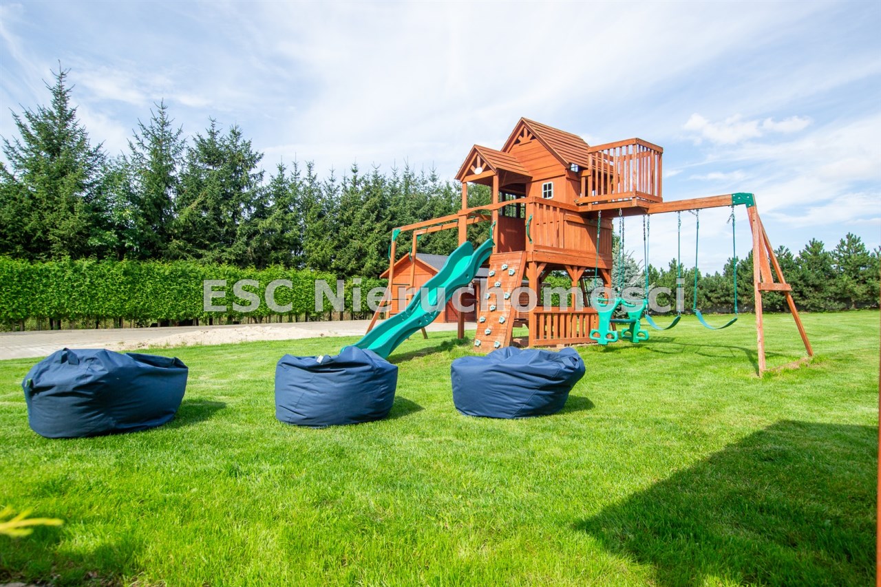 Za domem działka jest dostosowana pod potrzeby mieszkańców - stoi tu basen, plac zabaw dla dzieci ale jest  jeszcze sporo wolnej przestrzeni do zagospodarowania. Jest tam też drewniana architektura ogrodowa: zadaszone pomieszczenie na drewno, kojce z budami dla psów, pomieszczenie gospodarcze na narzędzia. Całość działki wzdłuż granicy obsadzona jest tujami i sosnami, część przed domem wyłożona kostką brukową, na pozostałej zadbany trawnik z automatycznym nawodnieniem sterowanym pilotem lub programowanym godzinowo sterownikiem.