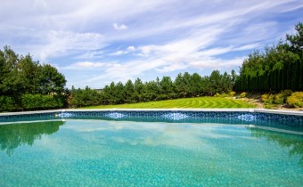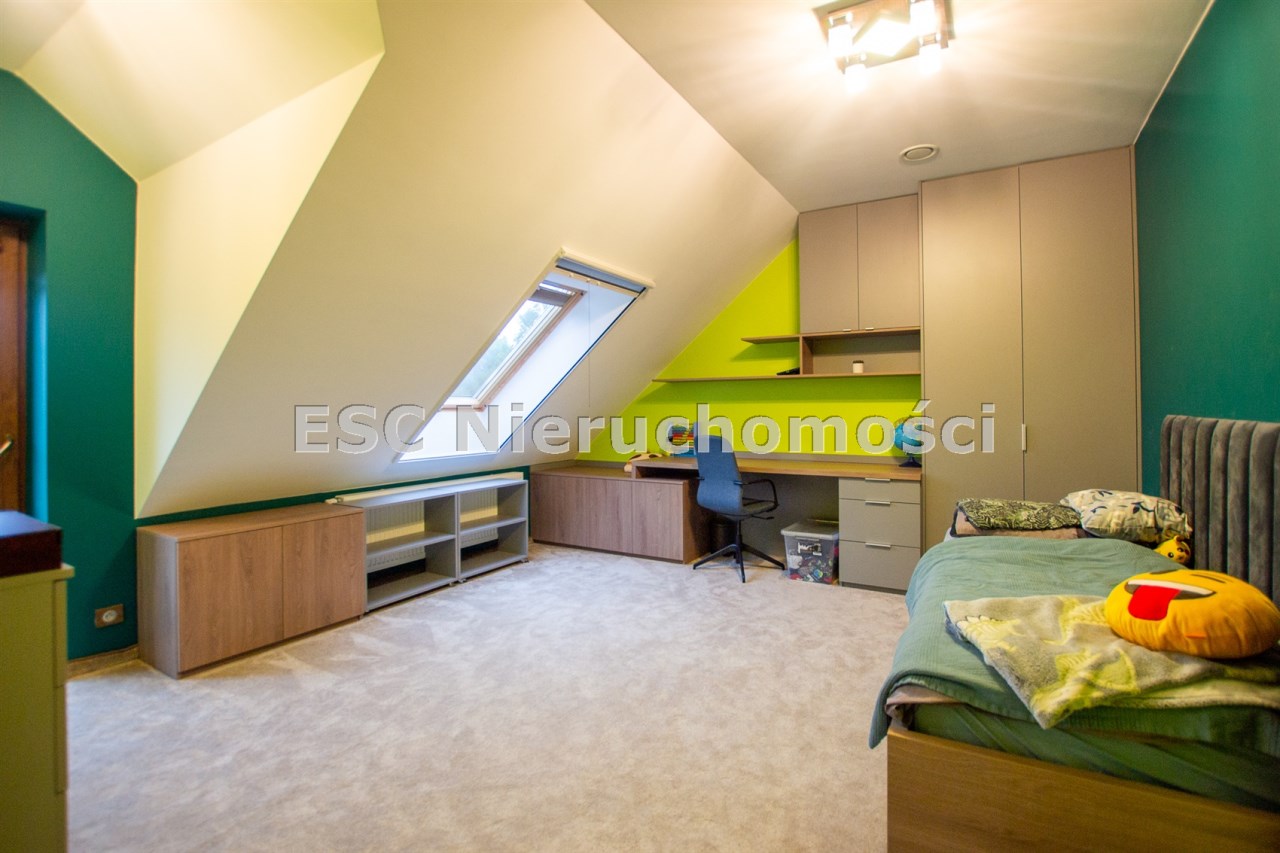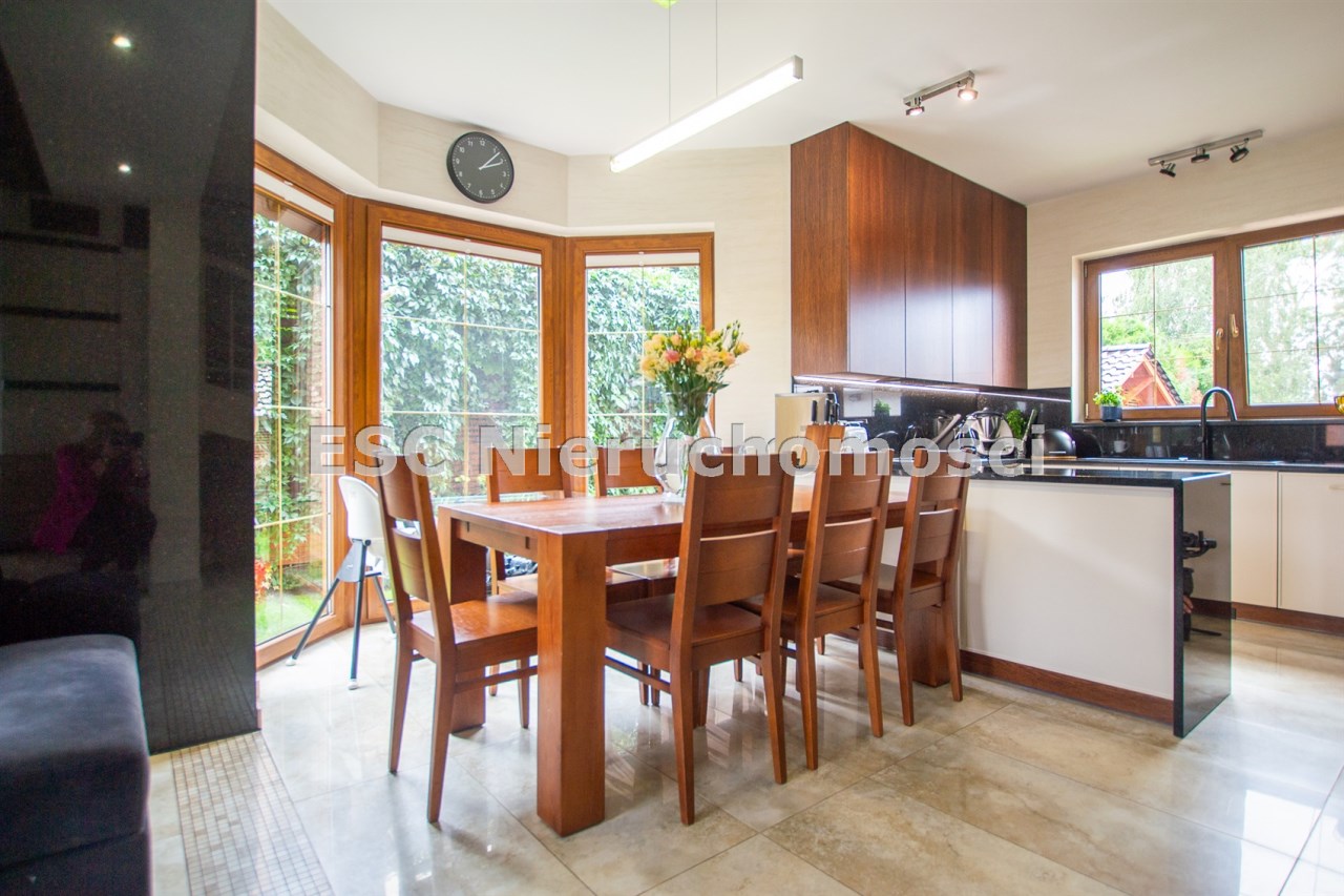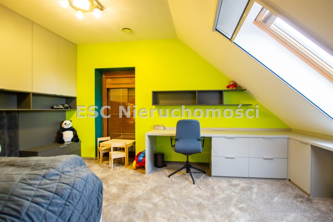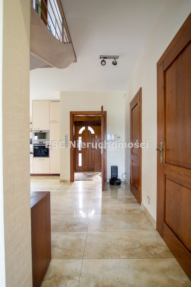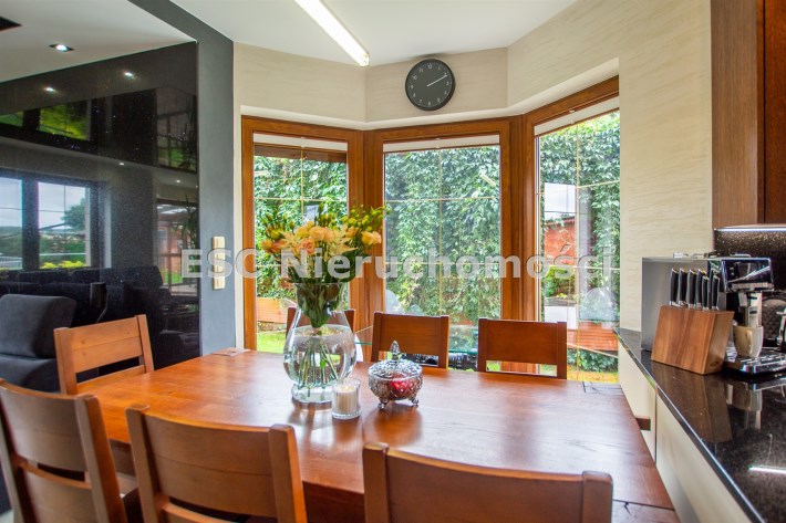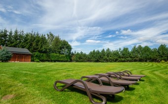 Za domem działka jest dostosowana pod potrzeby mieszkańców - stoi tu basen, plac zabaw dla dzieci ale jest  jeszcze sporo wolnej przestrzeni do zagospodarowania. Jest tam też drewniana architektura ogrodowa: zadaszone pomieszczenie na drewno, kojce z budami dla psów, pomieszczenie gospodarcze na narzędzia. Całość działki wzdłuż granicy obsadzona jest tujami i sosnami, część przed domem wyłożona kostką brukową, na pozostałej zadbany trawnik z automatycznym nawodnieniem sterowanym pilotem lub programowanym godzinowo sterownikiem.
