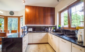 Budynek mieszkalny ma wyraźnie podzielone strefy - na parterze, którego większa część jest otwartą przestrzenią mamy salon z kominkiem na drewno, aneks kuchenny z jadalnią, łazienkę, gabinet i wyjście na taras. Na parterze znajduję się kotłownia z piecem gazowym, pralnia z pomieszczeniem gospodarczym.