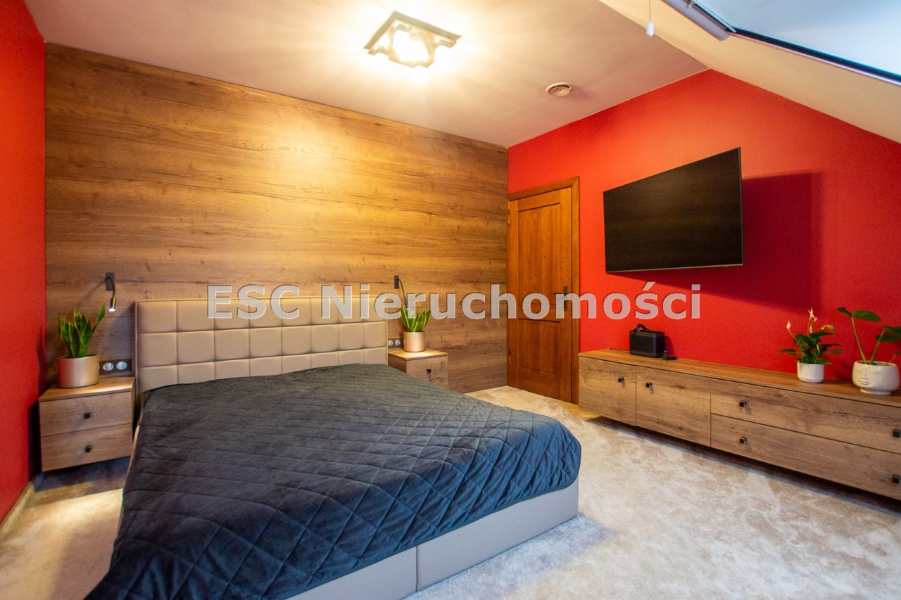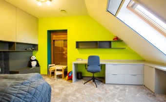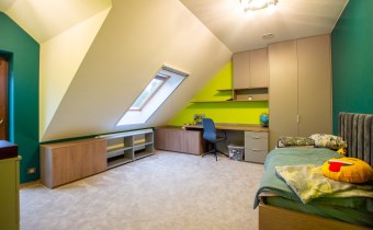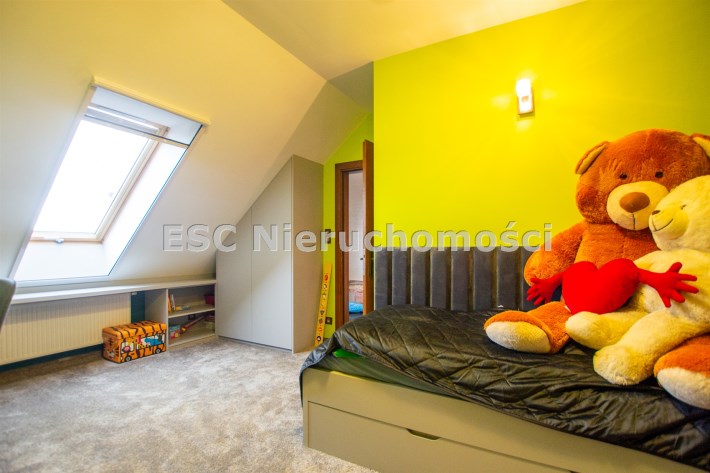 Na piętrze strefa sypialna - dwa pokoje dziecięce, sypialnia główna z garderobą oraz łazienka z wanną i prysznicem. Każdy pokój posiada balkon.