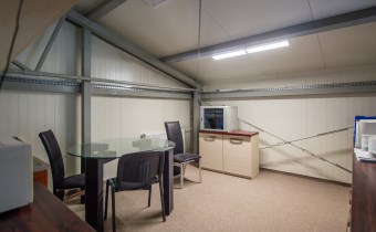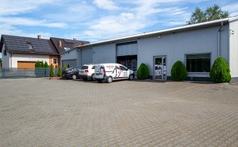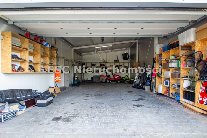 2 garaż), która dzięki odrębnemu parkingowi i dodatkowej bramie może funkcjonować całkowicie niezależnie od części mieszkalnej. Hala o wysokości 5,8 m ma na dole biuro i łazienkę, a na górze zaplecze socjalne (drugie biuro, dodatkowa łazienka, przebieralnia). Wymiary bram: 1 - wysokość - 410cm i szerokość 335 cm, 2 - wysokość 410 cm i szerokość 355cm