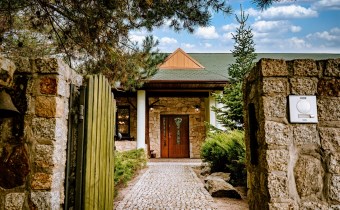Front z murowanym ogrodzeniem i bramą na pilota, w środku – zieleń, kwiaty, szklarnia, wędzarnia.