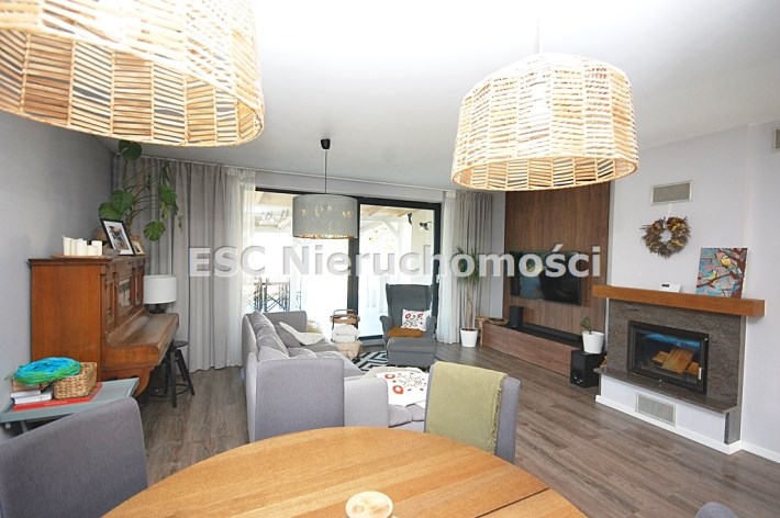Salon podłoga w panelach,ściany gipsowane-malowane,wyposażony w kominek z płaszczem wodnym,świetnie doświetlony oknem balkonowym oraz tarasowym