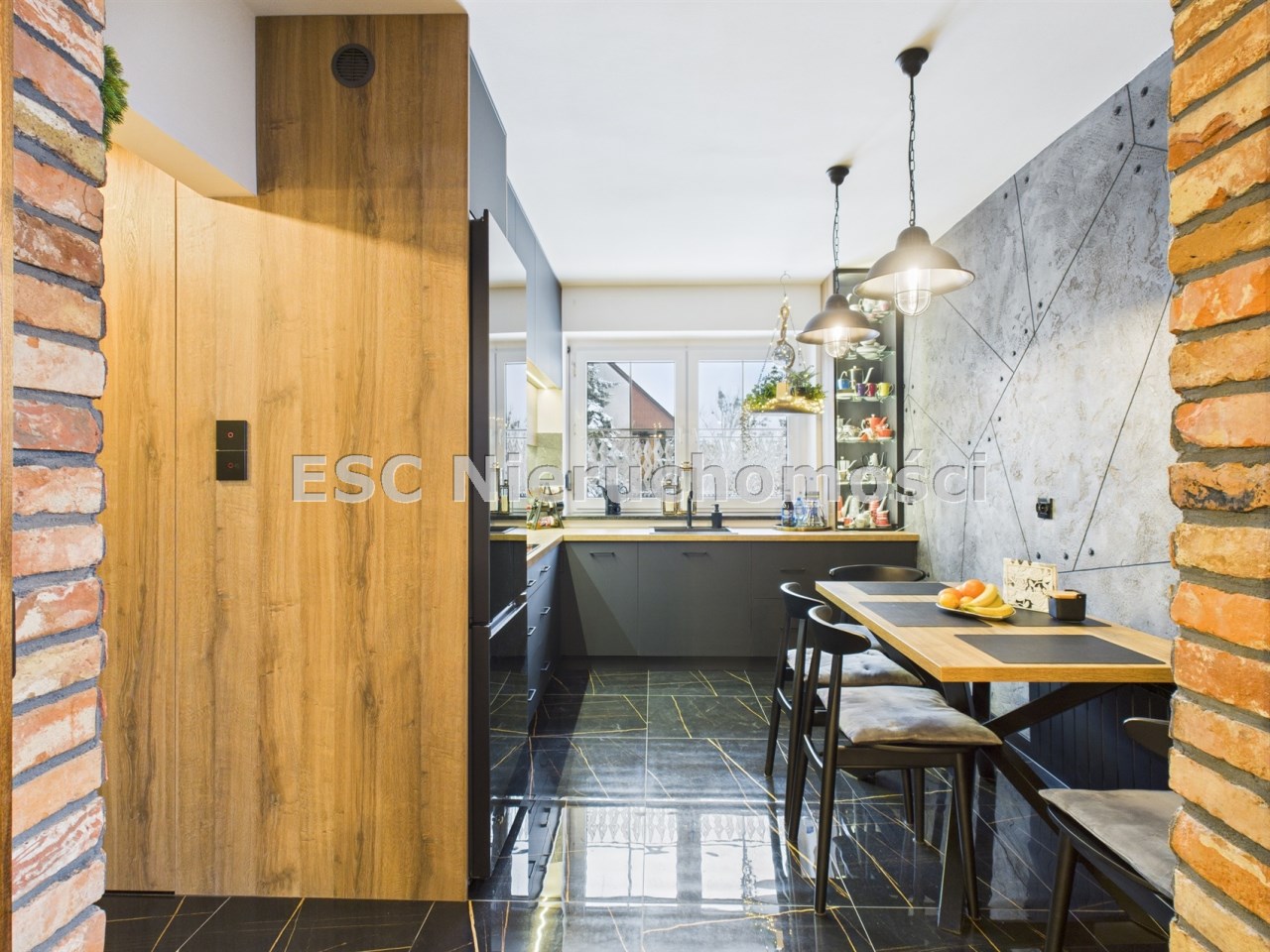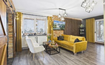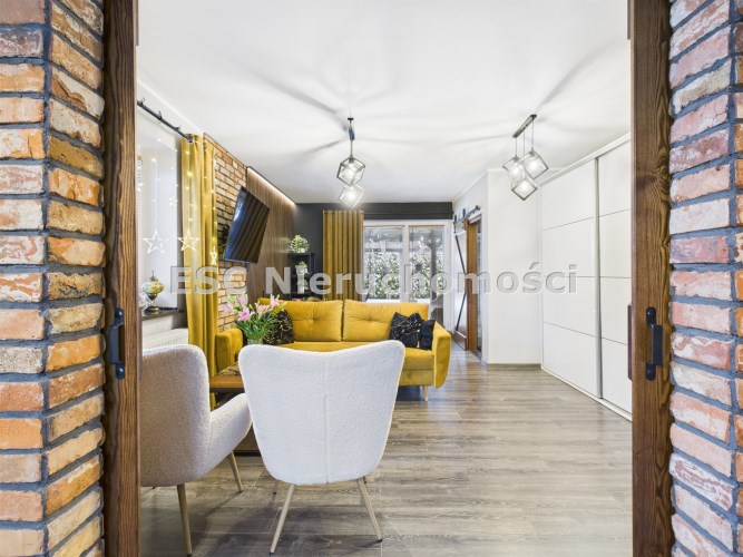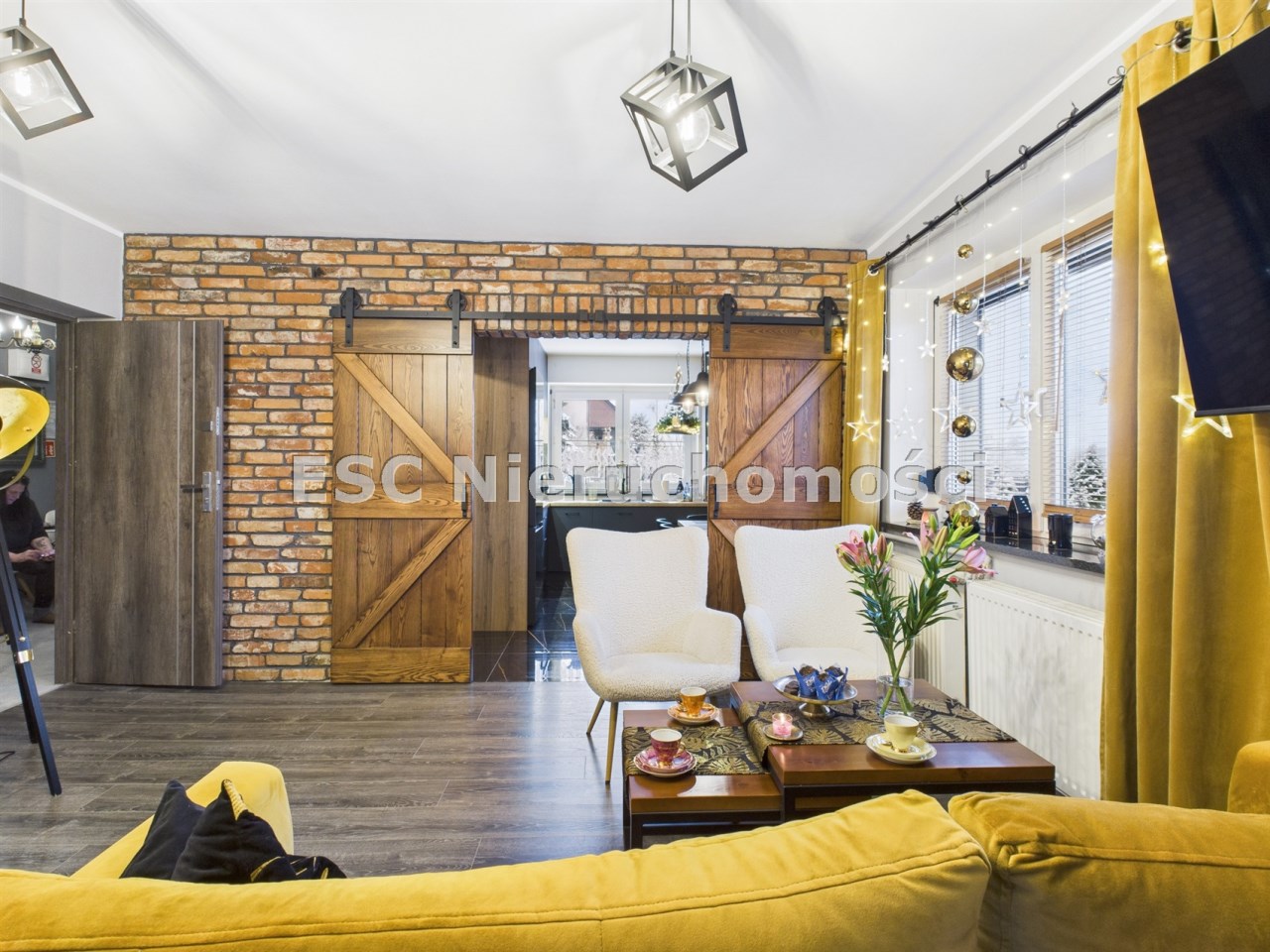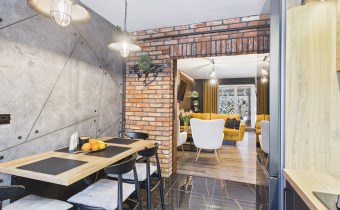 W aranżacji domu wykorzystano m.in. 120-letnią cegłę, nadającą przestrzeni niepowtarzalnego stylu i ciepła. Całość dopełniają piękne detale, takie jak drewniane drzwi przesuwne prowadzące do kuchni i łazienki – rozwiązanie zarówno efektowne, jak i praktyczne.