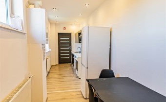 W kuchni meble kuchenne wraz ze sprzętem AGD (kuchenka gazowa, lodówko - zamrażarka, okap, stół + krzesła).