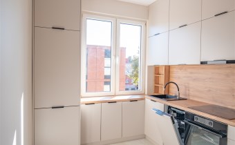 Kuchnia o powierzchni 7,9 m2 wyposażona w nowe meble robione na wymiar - w kolorze kaszmir oraz nowy sprzęt AGD (lodówka, zmywarka, piekarnik, płyta indukcyjna). Kuchnia wyposażona w duże okno, przez co jest bardzo jasna.