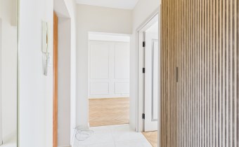 Przedpokój o powierzchni 4,2 m2, wyposażony w szafę wnękową z miejscem na pralkę i półkami, zapewnia dużo miejsca do przechowywania.