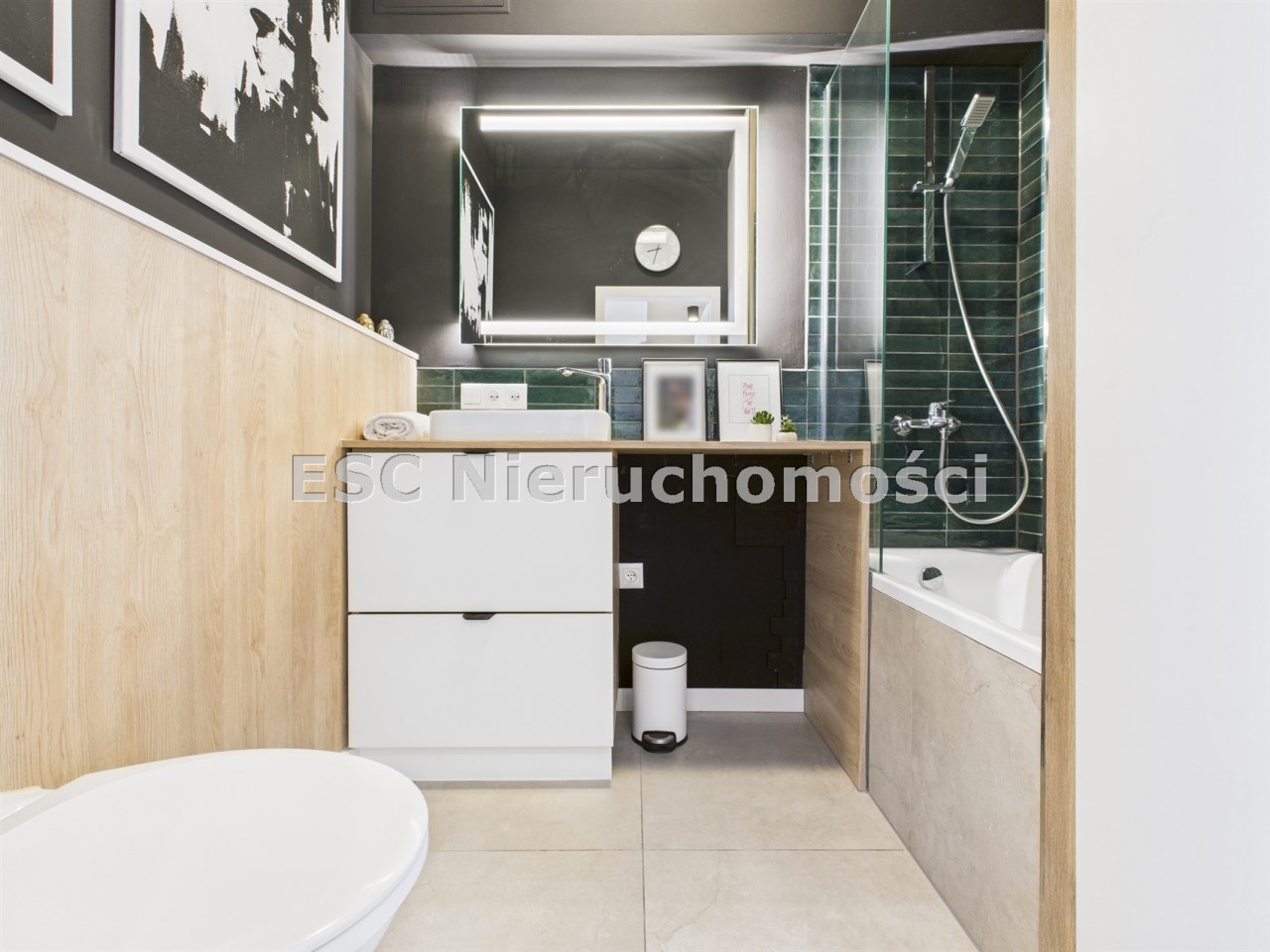 • Łazienka (3,7 m²) – funkcjonalna, z małą wanną z kolumną prysznicową oraz zabudowaną szafą na przechowywanie.