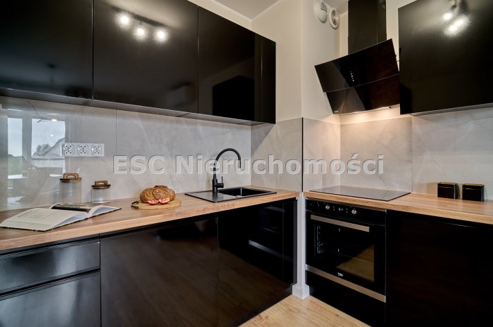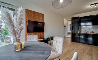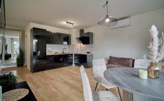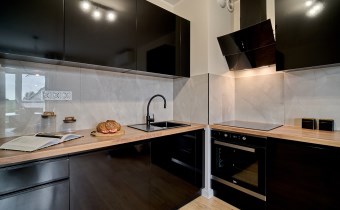 • Aneks kuchenny zawiera stylową zabudowę kuchenną w kolorze czarnym oraz niezbędny sprzęt AGD, taki jak: lodówko – zamrażarka, płyta elektryczna, piekarnik, okap, zmywarka.