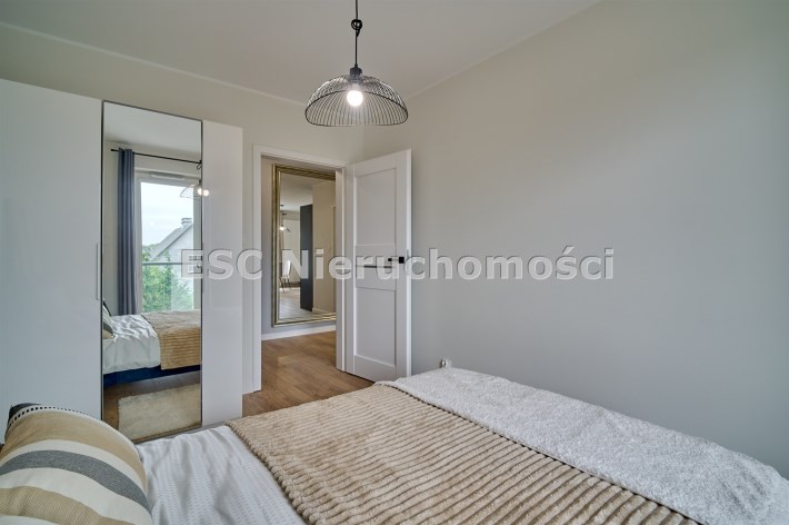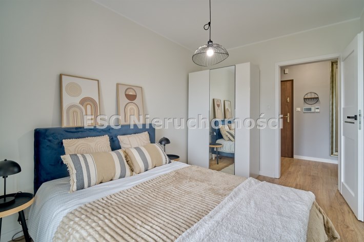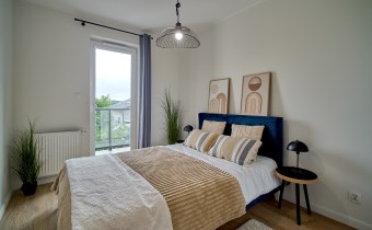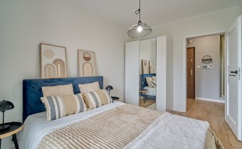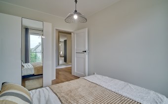 • W sypialni mieści się podwójne łóżko i pojemna szafa.