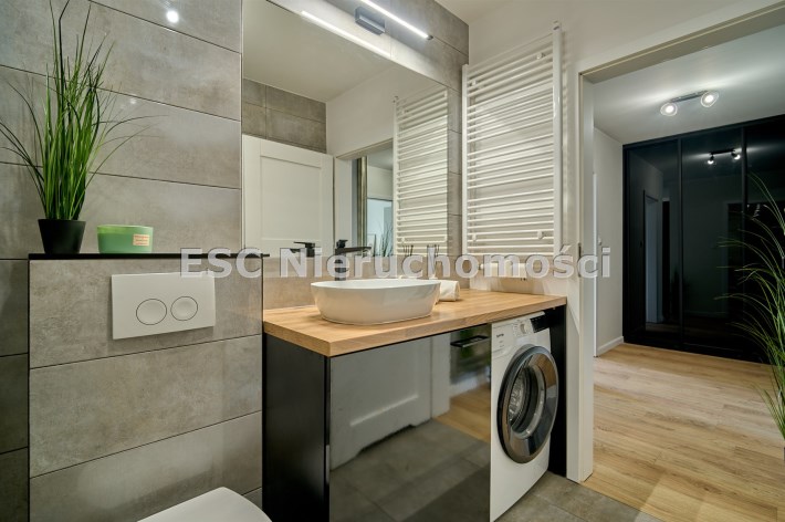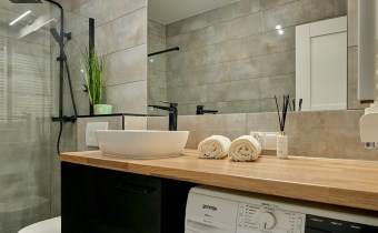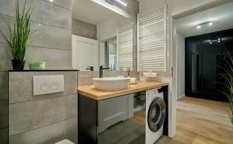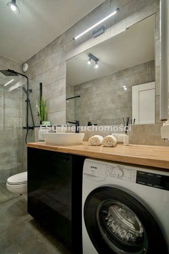 • Łazienka wyposażona została w kabinę prysznicową, szafkę z umywalką oraz pralkę.