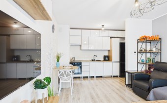 Z przestronnego salonu prowadzi wyjście na balkon o szerokości całego salonu, stanowiący idealne miejsce do wypoczynku. Kuchnia została wykonana w nowoczesnej zabudowie i wyposażona w nowoczesny sprzęt AGD, zapewniający komfort codziennego użytkowania. Mieszkanie oferuje liczne, pojemne szafy, które gwarantują dużą ilość miejsca do przechowywania.