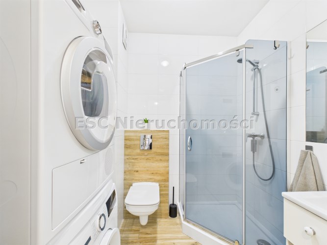 Całość urządzona w spójnym, nowoczesnym stylu i gotowa do zamieszkania bez dodatkowych nakładów finansowych. Łazienka została w pełni wyposażona i posiada prysznic, pralkę oraz suszarkę, co znacząco podnosi komfort użytkowania.