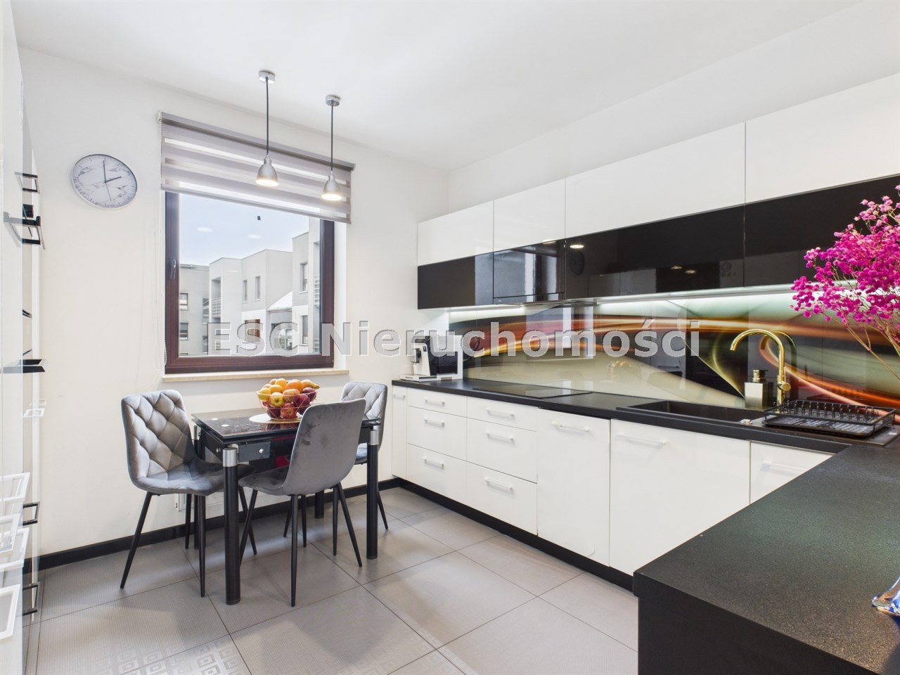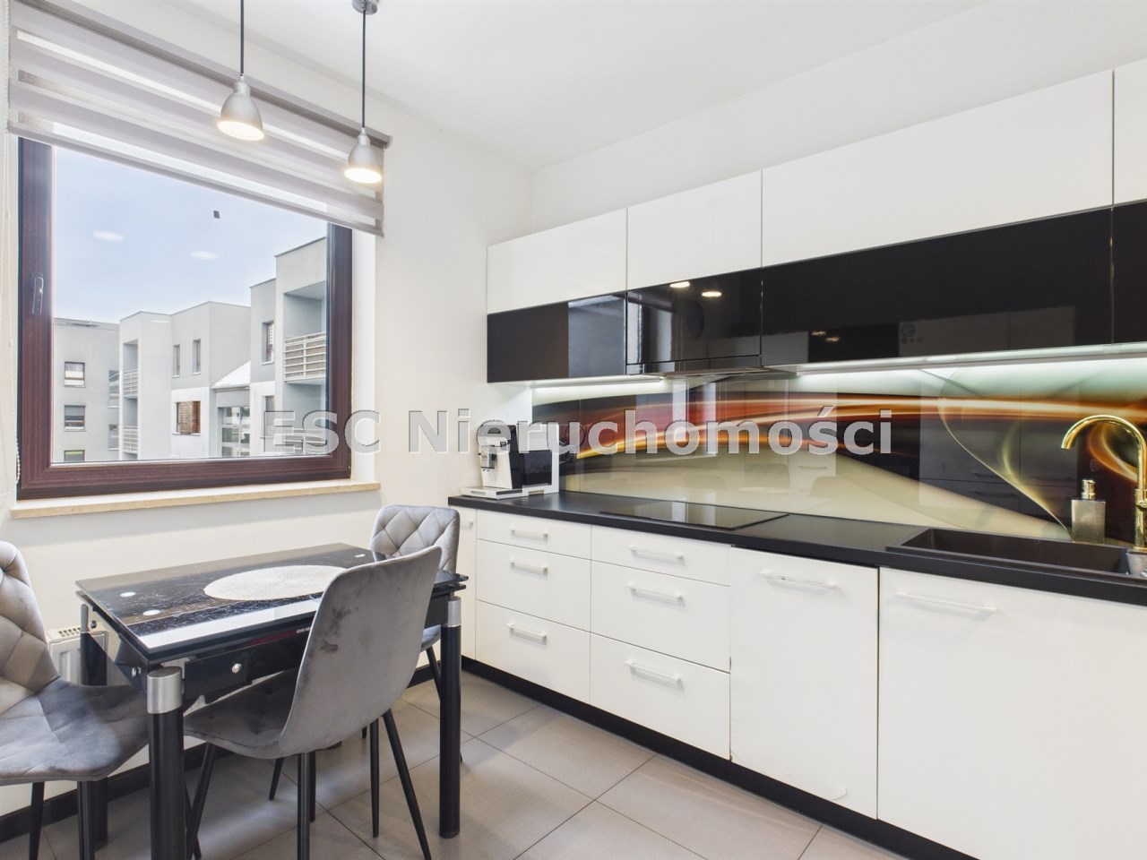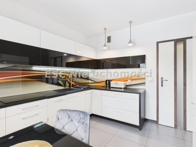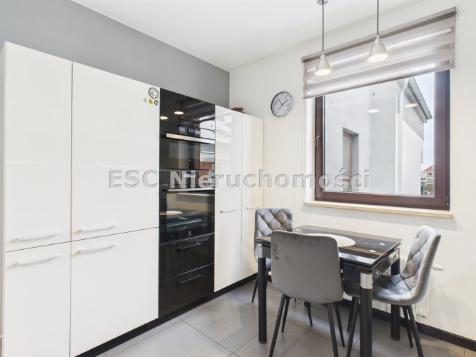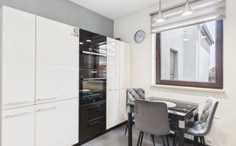 płyta indukcyjna, okap, piekarnik, mikrofala, zmywarka oraz lodówka. Stół i 3 krzesła tworzą wygodną przestrzeń do codziennych posiłków.