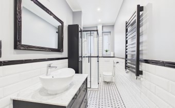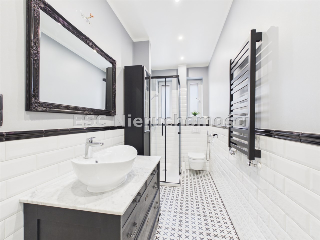 - w łazience zainstalowano ogrzewanie podłogowe wodne - cieplutko w stopy po kąpieli, na wposażeniu jest również odnowiona szafka vintage z marmurowym blatem,