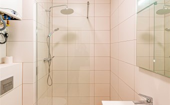 W łazience kabina prysznicowa, umywalka z szafką i lustrem, wc, grzejnik drabinka i pralka.
