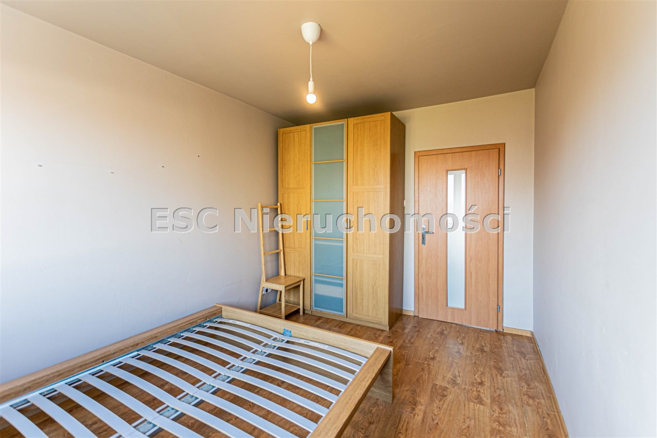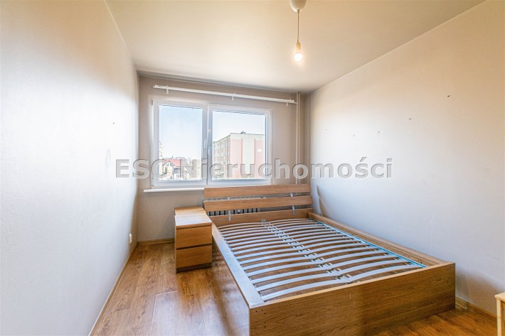 W sypialni - szafa oraz stelaż łóżka, pozostałe pokoje bez mebli.