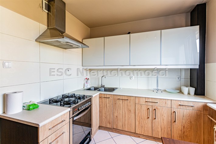 W kuchni - zabudowa kuchenna wraz z sprzętem AGD - lodówko-zamrażarka, zmywarka, kuchenka gazowa, okap i zlewozmywak i baterią.