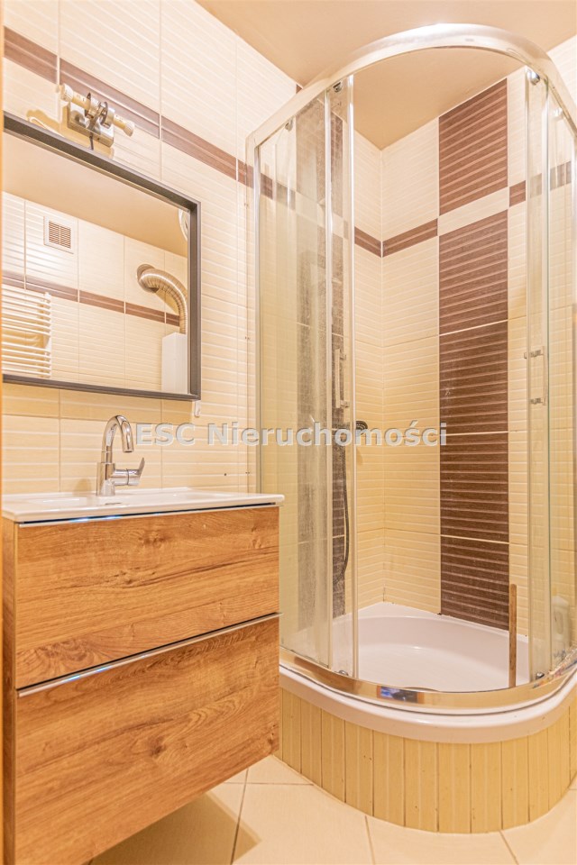 W łazience - kabina prysznicowa, umywalka, lustro, grzejnik typu drabinka i junkers.